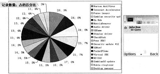 當用戶打開含有CommWarrior病毒的MMS消息后,該病毒將在手機中進行安裝,并開始向手機號碼薄中的用戶隨機發(fā)送含有自身拷貝的MMS消息。同時,CommWarrior會偽造彩信主題進行傳播,通常包含著這樣的內容“來自我的3D游戲!免費!”以及“適合所有型號諾基亞手機的鈴聲”等,使得接受彩信的用戶不會引起警覺,具體各類的消息內容的比例如圖2所示。