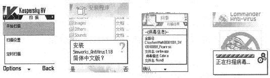 (3)針對目前智能手機感染的典型病毒:CommWarrior、Cabir手機病毒和Mabir.A手機病毒,各軟件公司已經陸續(xù)推出了一些防病毒軟件,如NetQin手機殺毒系統(tǒng)、金山手機毒霸、卡巴斯基手機殺毒軟件、光華反病毒手機殺毒軟件SymbianS60、TSG_Phone_Safe_殺手機病毒軟件、Anti-Virus.v1.10、Simworks_AnitiVirus_1.16等。各運營商可以推薦用戶進行相關軟件的加載,手機廠家也可以根據自身情況出廠時預裝一些殺毒軟件(見圖5)。