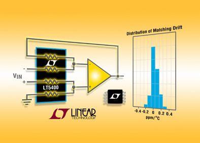 凌力爾特公司(Linear Technology Corporation)推出公司第一個精確匹配的電阻器網(wǎng)絡(luò)器件系列LT5400,該系列器件為差分放大器、精準分壓器、基準和橋式電路中的高性能信號調(diào)理應(yīng)用而設(shè)計。三款可選版本已全面投產(chǎn),分別是電阻比率為1:1和10:1的四個10K電阻、四個100K電阻和兩個10K/兩個100K電阻。每款LT5400系列器件在-40℃至85℃的溫度范圍內(nèi)提供了0.01%的保證匹配準確度,而在-40℃至125℃則提供 0.0125%。LT5400的匹配性能利用“CMRR 匹配”得以增強,這是在采用差分放大器電路配置時用于保證CMRR性能的一種新度量標準。LT5400的CMRR匹配誤差僅為0.005%,比采用獨立電阻器時的0.01%匹配誤差改進了2倍。