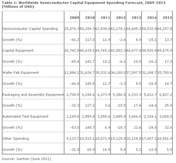 半導(dǎo)體資本設(shè)備市場(chǎng)的所有領(lǐng)域預(yù)計(jì)都將在2011年呈現(xiàn)增長(zhǎng)態(tài)勢(shì)(見(jiàn)表一)。 Gartner分析師表示,2011年的支出是由積極的晶圓設(shè)備制造支出,處于領(lǐng)先的集成設(shè)備制造商(IDM)邏輯能力的加速生產(chǎn),以及內(nèi)存公司加速雙重曝光等因素推動(dòng)的。2012年,半導(dǎo)體資本設(shè)備支出將下滑2.6%,隨后將在2013年增長(zhǎng)8.9%。隨著內(nèi)存供過(guò)于求的影響,周期性的下跌應(yīng)該在 2013年底出現(xiàn)。