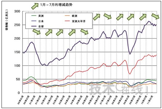 全球及各地區(qū)單月半導(dǎo)體銷售額(3個月的移動平均值)走勢(數(shù)據(jù)由SIA及WSTS提供)1月~7月的增減趨勢用箭頭標(biāo)出。