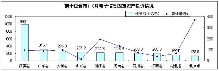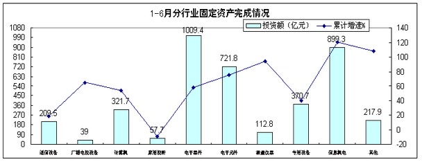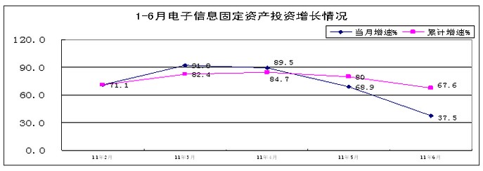 上半年,電子信息產(chǎn)業(yè)500萬元以上項目完成投資3960億元,規(guī)模接近去年前三季度水平,同比增長67.6%,高于去年同期26.6個百分點(diǎn),高于同期工業(yè)投資40.7個百分點(diǎn)。自二季度起,投資增速高位回落,6月份增速(37.5%)比4、5月份分別回落52和31.4個百分點(diǎn)。