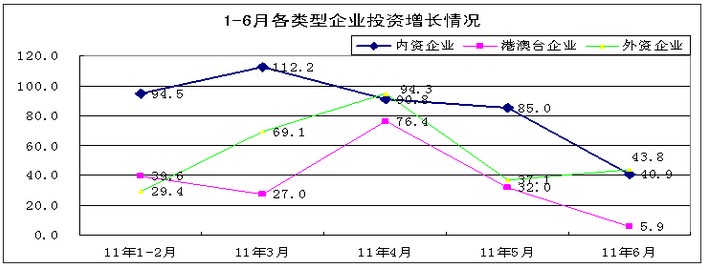 港澳臺企業(yè)完成投資401億元,同比增長32.6%,低于全行業(yè)35個百分點(diǎn),其中6月份增長5.9%,比5月回落26.1個百分點(diǎn)。外商投資企業(yè)完成投資613億元,同比增長50.1%,6月份增長43.8%,高于5月份增速6.7個百分點(diǎn)。