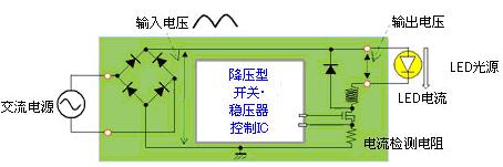 羅姆為了適應(yīng)上述市場需求而在進(jìn)行LED照明用驅(qū)動器IC的開發(fā)。為使LED保持一定的亮度點燈,需要有進(jìn)行恒流控制的LED驅(qū)動器IC。通常,是從交流電源開始進(jìn)行恒流控制,所以使用降壓型開關(guān)穩(wěn)壓器方式(圖1)。
