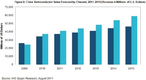 圖中所示為IHS iSuppli公司對(duì)中國(guó)半導(dǎo)體銷售額的預(yù)測(cè),按渠道細(xì)分。