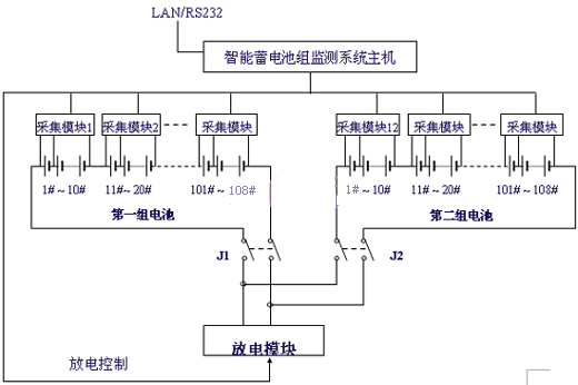 與電池巡檢儀不同,在這個(gè)系統(tǒng)增加了一個(gè)放電模塊,放電模塊能承受較大的沖擊電流,它接收監(jiān)控主機(jī)的放電命令,接通放電回路,電池通過負(fù)載放電,同時(shí)采集模塊將采集每節(jié)電池電壓的變化,在主機(jī)中得到了每節(jié)電池內(nèi)阻特性曲線。放電模塊也可作為長時(shí)間放電負(fù)載,實(shí)現(xiàn)對電池容量的核對性測試及整組電池的活化處理。這個(gè)系統(tǒng)實(shí)現(xiàn)對蓄電池全方面的監(jiān)測和維護(hù)管理。