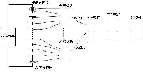 在電力系統(tǒng)變電站目前使用較多的蓄電池在線監(jiān)測裝置是電池巡檢儀,電池巡檢儀又分為兩種,一種是測量蓄電池單體電壓的巡檢儀,結(jié)構(gòu)是由一個(gè)主控模塊和數(shù)個(gè)采集模塊組成,主模塊接收監(jiān)控器的命令,發(fā)送電池?cái)?shù)據(jù)到直流設(shè)備的監(jiān)控器;采集模塊中每個(gè)模塊采集10~20節(jié)電池的電壓、電流和溫度;通過直流充電設(shè)備的監(jiān)控器可顯示各單節(jié)電池電壓,判斷故障電池的編號且給出報(bào)警。這類電池巡監(jiān)儀一般由直流設(shè)備生產(chǎn)廠家提供,在訂貨直流設(shè)備時(shí)它是選配裝置,由于功能單一、不能測試容量、且測量精度差、容易誤報(bào),限制了它的廣泛使用。測試示意圖如圖1: