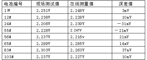 根據(jù)規(guī)程的要求,日常測量蓄電池端電壓采用是高精度4位半的數(shù)字萬用表,一般高精度萬用表蓄電池直流電壓檔測量精度為0.7%以上,絕大多數(shù)蓄電池在線裝置產(chǎn)品說明書上提到的測量精度達(dá)到了0.5%以上;顯示測量數(shù)值有些蓄電池在線裝置的測量端電壓數(shù)值為小數(shù)點(diǎn)后2位,與規(guī)程要求有較大誤差;有些裝置測量值雖可以到小數(shù)點(diǎn)后3位,但與實(shí)際用表測量數(shù)值相差較大。從運(yùn)行情況看,端電壓在線監(jiān)測的誤差是隨機(jī),每個(gè)數(shù)值偏差都不一致,而且偏差值隨著環(huán)境溫度、浮充電壓變化等而變化。表1為現(xiàn)場任意抽查幾個(gè)蓄電池浮充電壓,現(xiàn)場測試值與在線測量值的誤差情況,現(xiàn)場測試采用FLUK111數(shù)值萬用表直流檔測量精度0.7%,在線測量為許繼電源公司的WXJ-16型巡檢儀,測試環(huán)境溫度25℃。