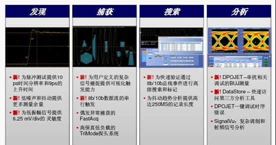 圖4:從發(fā)現(xiàn)、捕獲到搜索、分析,DPO/DSA70000D系列33GHz示波器囊括了多個行業(yè)第一和關鍵創(chuàng)新點。