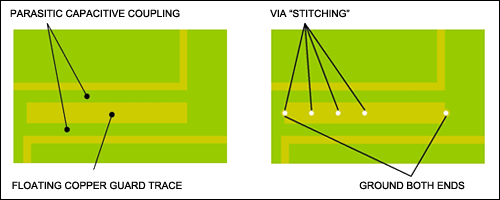 填充地也稱為保護線,通常將其用于電路中很難鋪設連續(xù)接地區(qū)域或需要屏蔽敏感電路的設計(圖10)。通過在引線兩端,或者是沿線放置接地過孔(即過孔陣列),增大屏蔽效應。請不要將保護線與設計用來提供返回電流通路的引線相混合,這樣的布局會引入串擾。