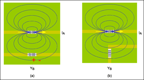 式中,YB是向電路B注入的誤差電壓,IA是在電路A作用的電流1。LM對電路間距、電感環(huán)路面積(即磁通量)以及環(huán)路方向非常敏感。因此,緊湊的電路布局和降低耦合之間的最佳平衡是正確排列所有電感的方向。