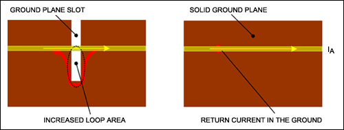 返回電流通路須盡可能靠近主電流通道,將輻射磁場降至最小。這種布局有助于減小電流環(huán)路面積。返回電流的理想低阻通路通常是引線下方的接地區(qū)域—將環(huán)路面積有效限制在電介質(zhì)厚度乘以引線長度的區(qū)域。但是,如果接地區(qū)域被分割開,則會增大環(huán)路面積(圖3)。對于穿過分割區(qū)域的引線,返回電流將被強制通過高阻通路,大大提高了電流環(huán)路面積。這種布局還使電路引線更容易受互感的影響。