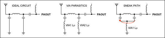 寄生電感往往對旁路電容的連接影響很大。理想的旁路電容在電源層與地層之間提供高頻短路,但是,非理想過孔則會影響地層和電源層之間的低感通路。典型的PCB過孔(d = 10 mil、h = 62.5 mil)大約等效于一個1.34nH電感。給定ISM-RF產(chǎn)品的特定工作頻率,過孔會對敏感電路(例如,諧振槽路、濾波器以及匹配網(wǎng)絡等)造成不良影響。