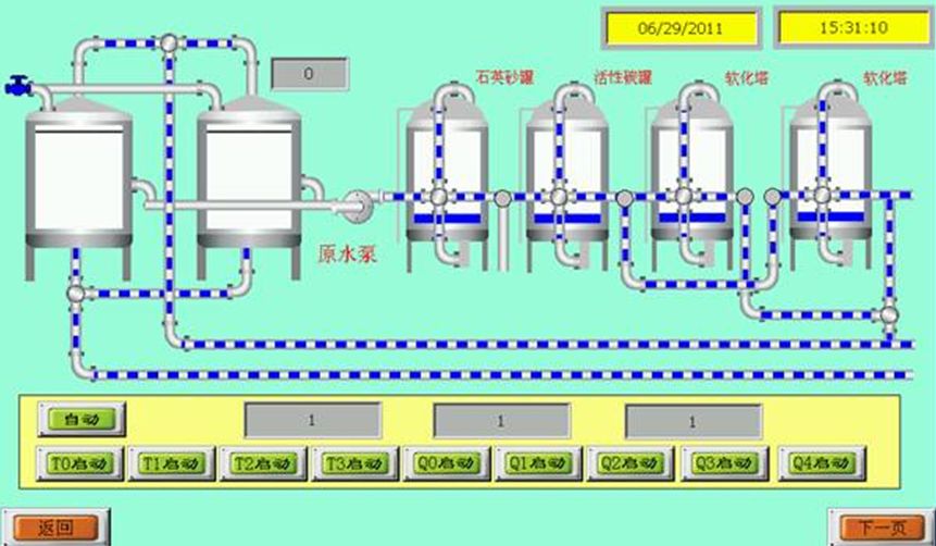 制藥用水是不含任何添加物的工藝用水。制藥用水的系統(tǒng)控制要控制這些雜質(zhì)的含量,同時還要有效處理和控制微生物及細(xì)菌內(nèi)毒素的污染。通常會采用離子樹脂交換、蒸餾冷凝、電滲析、反滲透等工藝方式。其制備流程大致分為五部分:預(yù)處理、初級除鹽裝置、深度除鹽裝置、后處理裝置、純水輸送分配系統(tǒng)。純化水設(shè)備包含機械部分和電氣部分:機械部分主要由水泵、壓力罐、水箱、電磁閥、過濾器和管路組成;電氣部分主要由可編程控制器(PLC)、觸摸屏、變頻器、壓力表、繼電器等組成。圖1為制備純化水的一個現(xiàn)場展示案例。