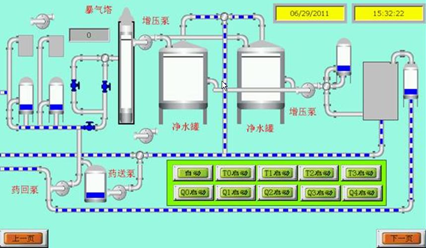觸摸屏主要功能是顯示和控制制水過程中的數(shù)據(jù)以及水泵電磁閥的的運行狀態(tài)。PLC輸入量有各個閥門的開閉情況和各罐體的液位情況和壓力情況,其中輸入量中的液位是模擬量輸入;輸出量有水泵的啟動停止,電磁閥的開閉,報警等等。圖3為部分觸摸屏的控制界面(初期設(shè)計)。
