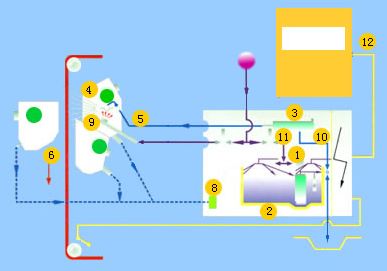 其工藝過程如圖3所示,泵①抽取液槽②的液體或水,通過過濾器③輸送到噴盤架⑤上各種噴盤④中;當(dāng)平幅運行的織物⑥通過時,液體便噴射其上;末被噴射到織物上的液體則通過回流管⑦流回到液槽;通過預(yù)過濾器⑧清除回流液體中的雜質(zhì);清洗裝置⑨⑩⑾保證了供液體單元的清洗,控制單元⑿控制整個裝置。