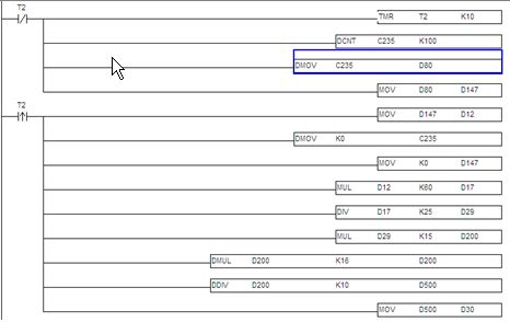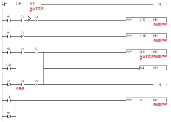 3.2.1測速程序:此部分程序原理就是采用PLC內(nèi)置的高速計算功能,計算單位時間內(nèi)從測速編碼器過來的脈沖數(shù),然后根據(jù)相關(guān)機械系數(shù)折算成線速度,這個值作為計算供水泵頻率的一個系數(shù),然后根據(jù)濕度設(shè)定值,計算出實際所需的供水頻率。見圖8。
