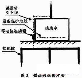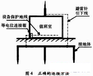 目前,關(guān)于共用接地有一種誤解,認(rèn)為將設(shè)備的接地引線無論怎樣連接,最終只要接在同一個接地體上就算是共用接地,如圖3所示。將“共引線”也誤認(rèn)為是“共地”。其實不然,所謂“共用接地”就是把許多不同性質(zhì)的接地裝置如電氣安全接地、交流電源工作地、通信及計算機直流地等匯集于一個等電位連接箱,使之成為一個等電位體,然后直接與接地體連接,而防雷地則通過另一條引下線與接地體連接。而不是將室內(nèi)設(shè)備接地與室外防直擊雷接地通過同一根引下線與地相連。更不允許將室內(nèi)接地引線與室外防直擊雷引線匯集與一個所謂的等電位連接箱,然后再與接地體相連。室內(nèi)接地引線要遠(yuǎn)離室外防雷引下線,如圖4所示。否則,遇雷擊時,強大的雷電流在通過引線向大地泄放的同時,室內(nèi)引線及所有設(shè)備上瞬間便會產(chǎn)生很高的電位差,設(shè)備難免遭到破壞。另外,假設(shè)與接地體相連的引線因銹蝕斷開或等電位連接端子接觸不良,一旦發(fā)生雷擊,強大的雷電流便會直擊至值班室設(shè)備上,這是非常危險的。