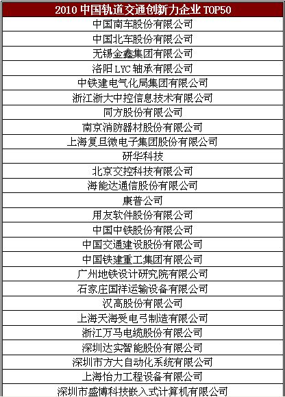 軌道交通創(chuàng)新力企業(yè)TOP50評價活動是軌道交通行業(yè)唯一的創(chuàng)新指數(shù)榜。自2008年起,由RT《軌道交通》雜志發(fā)起主辦,陸續(xù)得到《人民鐵道報》、中國企業(yè)評價協(xié)會的支持與聯(lián)合主辦。每年發(fā)布一次榜單并編輯出版該年度的產(chǎn)業(yè)發(fā)展報告。RT TOP50以關(guān)注軌道交通行業(yè)創(chuàng)新的投入、產(chǎn)出、應(yīng)用為主線,旨在總結(jié)梳理軌道交通行業(yè)的創(chuàng)新取得的成果,樹立行業(yè)創(chuàng)新標(biāo)桿,見證并推動軌道交通行業(yè)技術(shù)創(chuàng)新、管理創(chuàng)新及制度創(chuàng)新的發(fā)展,推動創(chuàng)新精神在產(chǎn)業(yè)進(jìn)步中發(fā)揮力量。