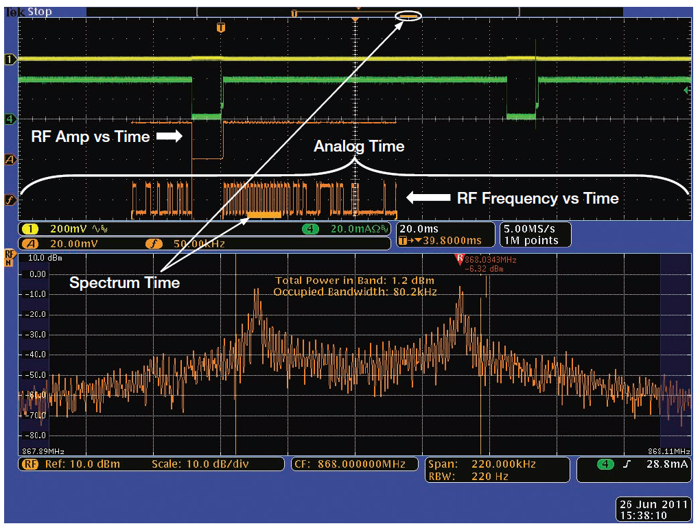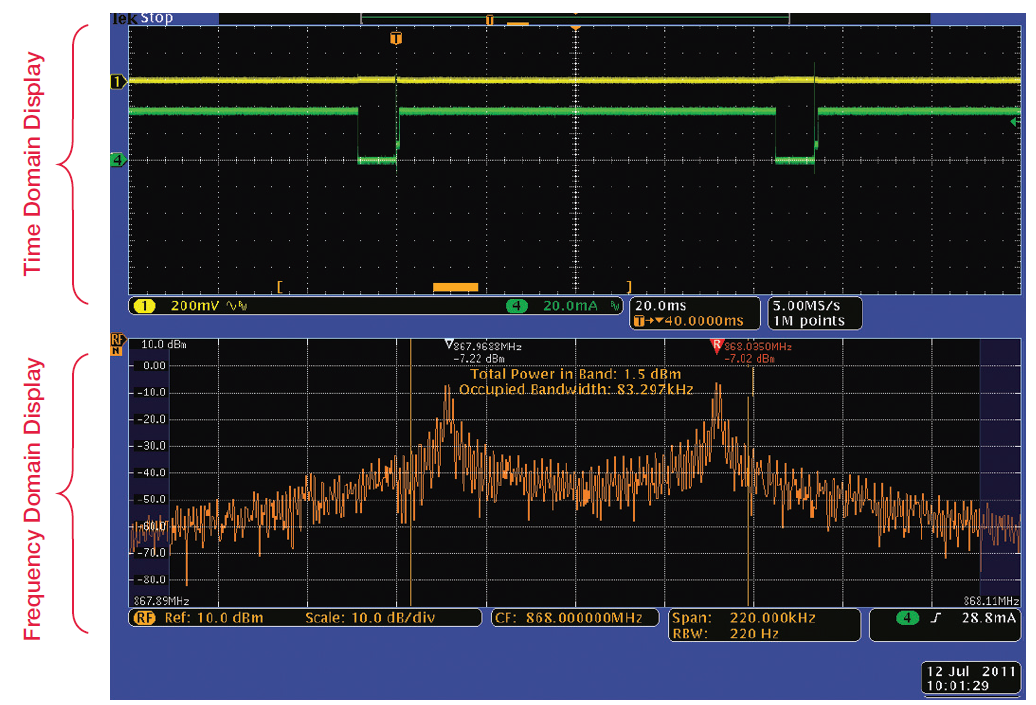 畫面的下半部分顯示了RF信號(hào)的頻域視圖,在本例中是無(wú)線電發(fā)射機(jī)輸出,畫面的上半部分是時(shí)域的傳統(tǒng)示波器視圖。頻域視圖中顯示的頻譜來(lái)自時(shí)域視圖中短橙色條指明的時(shí)間周期,稱為頻譜時(shí)間(Spectrum Time)。
