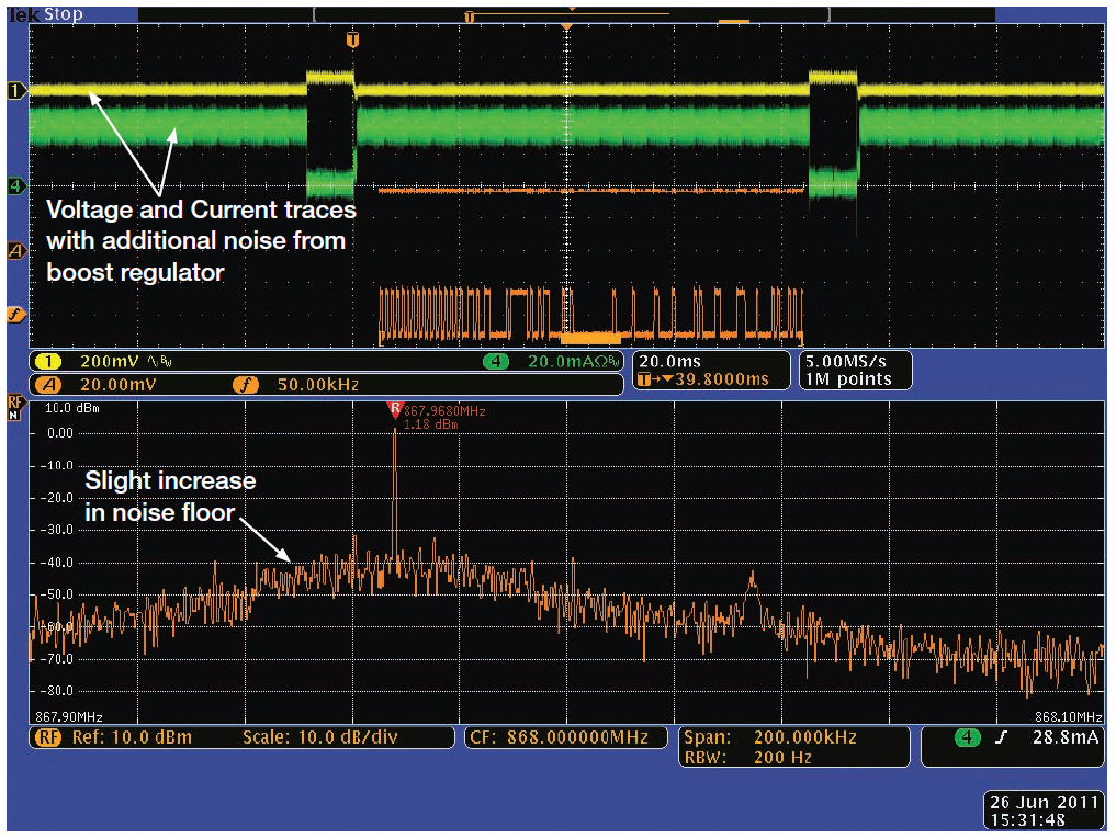 上圖是在使用干凈的實(shí)驗(yàn)室電源供電的模塊中獲得的,這在實(shí)際環(huán)境中很難實(shí)現(xiàn),但可以作用實(shí)用參考。圖4顯示了相同的RF信號(hào),但使用升壓型開(kāi)關(guān)電源為無(wú)線電模塊供電。升壓穩(wěn)壓器因產(chǎn)生噪聲而臭名昭著,但它允許使用一個(gè)或兩個(gè)堿性或鎳鎘單元及相對(duì)較少的器件,降低了成本。注意被調(diào)制信號(hào)底部的噪聲提高。在發(fā)送的信號(hào)附近,噪聲至少要比干凈的電源高5 dB。噪聲已經(jīng)容易地顯現(xiàn)在電流波形和電壓波形中。額外的噪聲還會(huì)令從發(fā)射機(jī)收集這些數(shù)據(jù)所使用的接收機(jī)上的信號(hào)信噪比劣化,降低無(wú)線電系統(tǒng)的有效范圍。