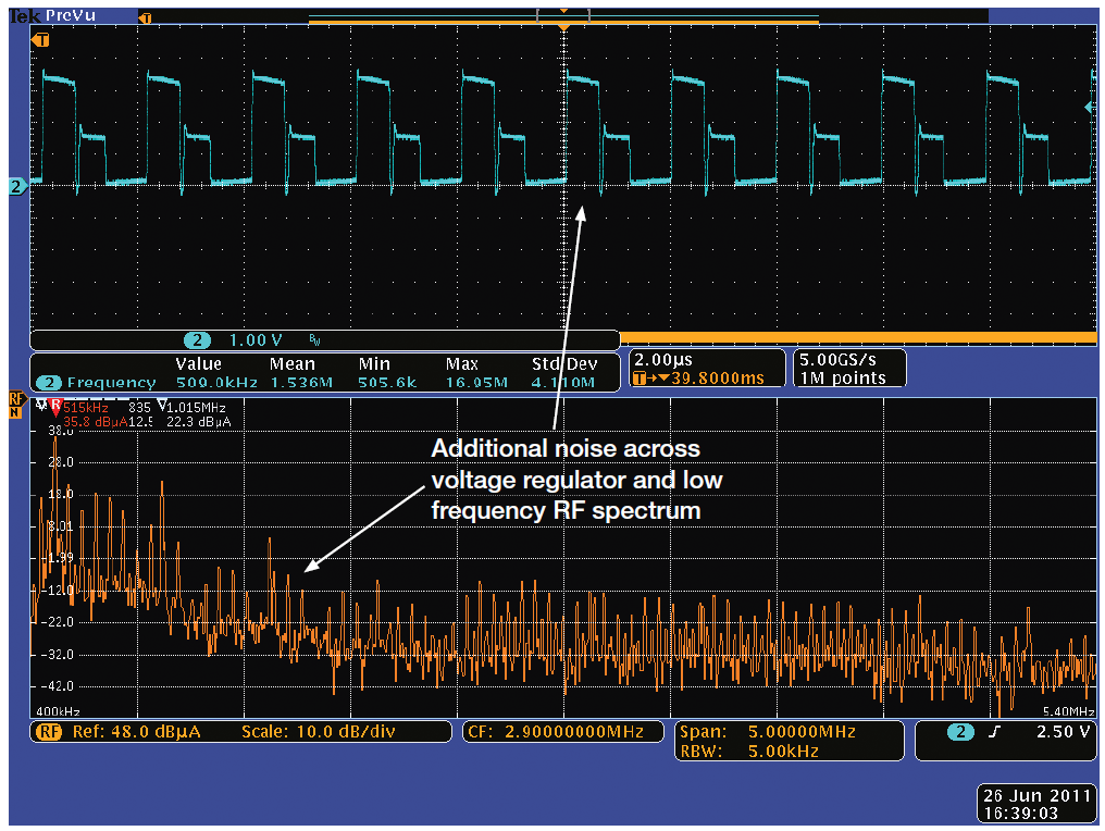 在電源驅(qū)動(dòng)RF電路板時(shí),噪聲功率的時(shí)域畫面和頻域畫面變化。圖6顯示了相同的電源噪聲及額外的信號(hào)。注意二階諧波下降,但有許多其它低電平噪聲。部分噪聲可能會(huì)給無(wú)線電接收機(jī)的運(yùn)行帶來(lái)很大干擾,需要認(rèn)真評(píng)估。