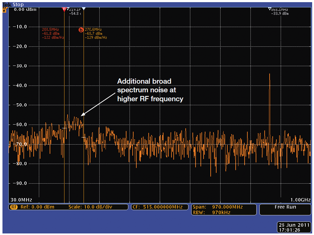 圖7. 在使用升壓轉(zhuǎn)換器時(shí)來(lái)自數(shù)字電路板的寬頻譜噪聲。