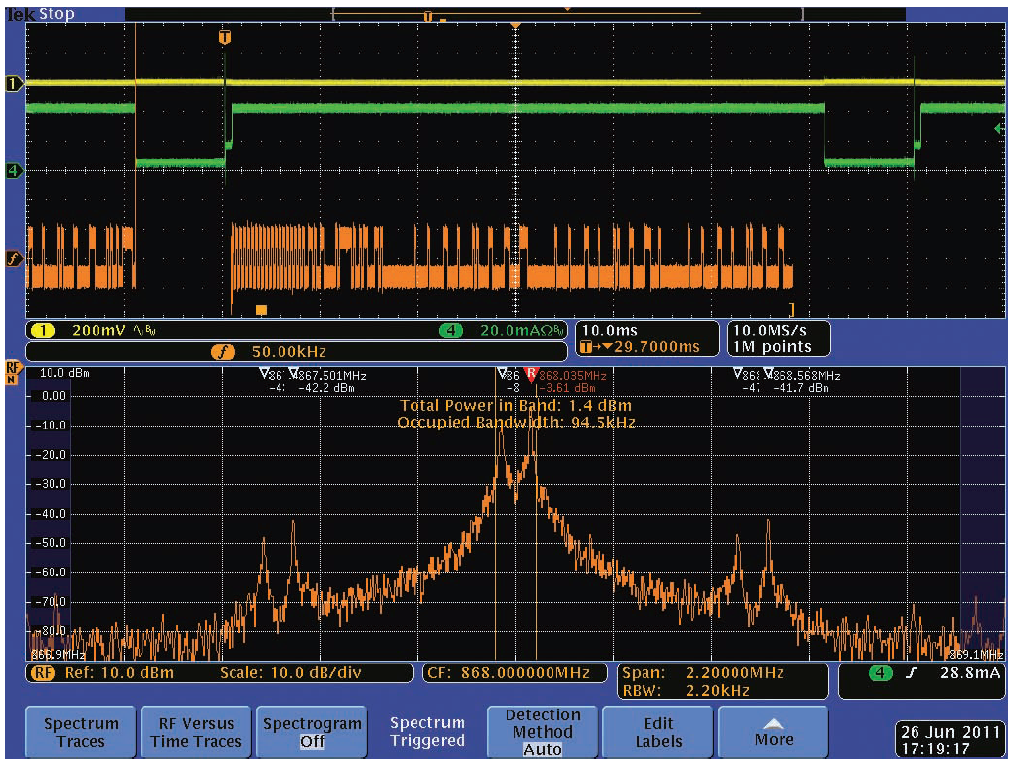 我們測(cè)量以868 MHz為中心的無(wú)線電頻譜,其擁有相當(dāng)?shù)偷? kbps的FSK調(diào)制數(shù)據(jù)速率,以供參考。圖2顯示了參考頻譜。注意MDO同時(shí)顯示時(shí)域視圖和頻域視圖,所有信號(hào)都時(shí)間相關(guān)。[page]