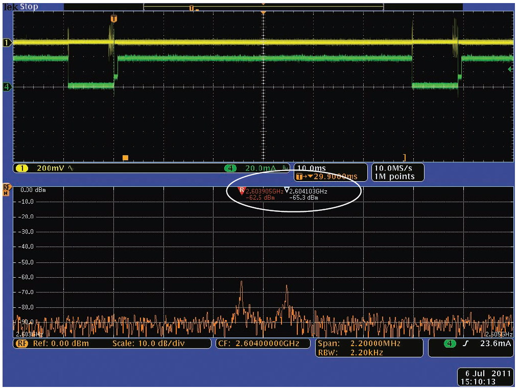 為簡(jiǎn)便地看到無(wú)線電中的數(shù)據(jù)包傳輸,我們?cè)跁r(shí)域視圖中增加了RF隨時(shí)間變化曲線。標(biāo)有“A”的橙色曲線顯示了瞬時(shí)RF幅離隨時(shí)間變化。標(biāo)有“f ”的橙色曲線顯示了相對(duì)于畫面中心頻率的瞬時(shí)RF頻率隨時(shí)間變化。綠色曲線(通道4)顯示了到模塊的電流??梢钥吹?,電流從數(shù)據(jù)包之間接近0上升到傳輸期間大約40 mA。黃色曲線(通道1)顯示了模塊電源電壓上的AC紋波。注意在傳輸期間只有很小的電壓暫降。