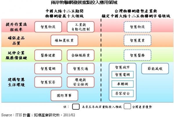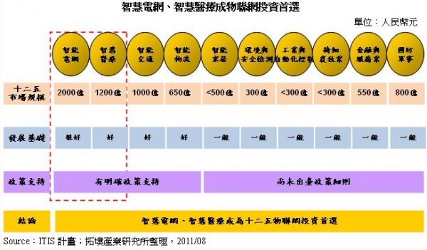 歐美經(jīng)濟(jì)體危機(jī)四伏,中國(guó)大陸市場(chǎng)需求反而撐起全球經(jīng)濟(jì)半邊天。不可諱言,面對(duì)全球不景氣環(huán)境,未來(lái)兩岸合作將是臺(tái)灣經(jīng)濟(jì)得以維持成長(zhǎng)的主要?jiǎng)幽苤?。根?jù)拓墣產(chǎn)業(yè)研究所ITIS計(jì)劃顯示,目前全球皆密切關(guān)注的“中國(guó)大陸十二五規(guī)劃”中,對(duì)于通訊基礎(chǔ)建設(shè)和IC產(chǎn)業(yè)的高度重視,連帶也為“物聯(lián)網(wǎng)”產(chǎn)業(yè)的快速發(fā)展埋下伏筆。