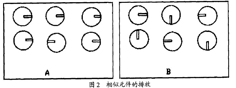 2)相似的元件在板面上應(yīng)以相同的方式排放。例如使所有徑向電容的負(fù)極朝向板件的右面,使所有雙列直插封裝(DIP)的缺口標(biāo)記面向同一方向等等,這樣可以加快插裝的速度并更易于發(fā)現(xiàn)錯(cuò)誤。如圖2示,由于A板采用了這種方法,所以能很容易地找到反向電容器,而B板查找則需要用較多時(shí)間。