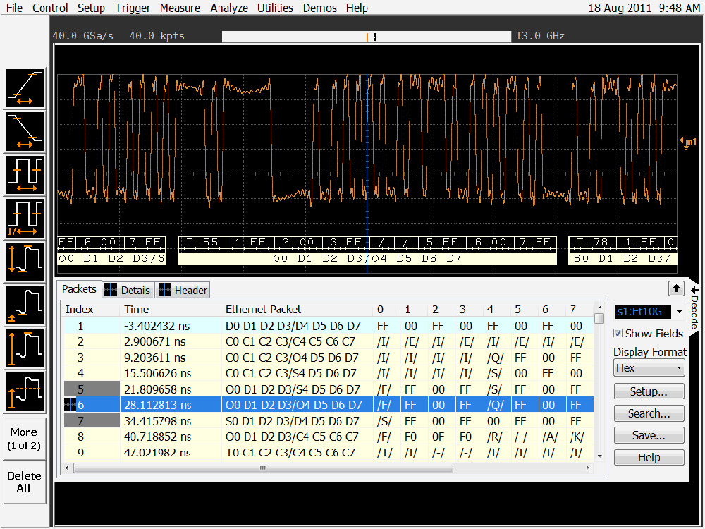 迄今為止,業(yè)界僅針對 I2C、SPI、CAN 等總線或基于 8b/10b 的解碼方案提供以示波器為基礎的協議解決方案,而 64b/66b 開發(fā)人員只能對這一復雜設計進行手動解碼。Agilent N8815A 以太網 10Gbase-KR 解碼應用軟件可以實時執(zhí)行解碼程序,使開發(fā)團隊能夠更快地推出優(yōu)質產品。