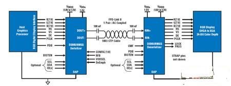 一旦接收器PLL鎖定在發(fā)射器的頻率下,即可由LOCK輸出標(biāo)志引腳顯示這一狀態(tài),確保接收器輸出的數(shù)據(jù)完整性。DS90UR907/8芯片組具有DS90UR905/6芯片組的一切特性,兩耳區(qū)別在于輸入輸出不再是發(fā)送LVCMOS信號(hào)的并行總線,而是遵照開放的工業(yè)標(biāo)準(zhǔn)"FPD-Link"。很多現(xiàn)代化的圖像控制器、顯示定時(shí)控制器、ASIC和FPGA都支持這種"一級(jí)串行化"技術(shù),它采用適合18bpp的3個(gè)數(shù)據(jù)通道,或者適合24bpp的4個(gè)數(shù)據(jù)通道,每一個(gè)都有一路并行時(shí)鐘通道。電信號(hào)的發(fā)送遵循開放的ANSI/TIA/EIA-644A標(biāo)準(zhǔn),該標(biāo)準(zhǔn)又稱作"LVDS"(低壓差分信號(hào)傳輸)。使用該接口技術(shù)代替常規(guī)LVCMOS的優(yōu)勢在于:采用差分信號(hào)可降低電磁干擾,并減少組件的引腳數(shù)量,如圖3所示。