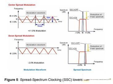 解串器通過一塊集成可配置的擴(kuò)頻時(shí)鐘(SSC)生成器得到增強(qiáng)。在接收器輸出總線端,這會(huì)導(dǎo)致輸出時(shí)鐘頻率和數(shù)據(jù)頻譜隨著時(shí)間推移而以幾十KHz的低調(diào)制率產(chǎn)生輕微變化。如圖5所示,頻率變化可以發(fā)生在名義像素時(shí)鐘中心頻率附近("中心擴(kuò)頻調(diào)制"),或朝向更低的頻率("向下擴(kuò)頻調(diào)制")。頻譜擴(kuò)展百分比可高達(dá)±2%。擴(kuò)頻時(shí)鐘將峰值能量分散在更寬的頻譜范圍內(nèi),從而大大降低了電磁干擾噪聲水平,而不是在同一時(shí)間點(diǎn)上、以恒定頻率來轉(zhuǎn)換所有輸出,此時(shí)的輻射噪聲集中在一個(gè)窄頻段內(nèi),所有輸出數(shù)據(jù)都與輸出時(shí)鐘同步,這使得數(shù)據(jù)和時(shí)鐘得到有效擴(kuò)展。特別是DS90UR906接收器輸出具有低壓(LV)CMOS接口選項(xiàng),可以大大降低電磁輻射。