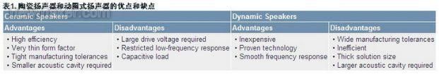 如今的便攜式設備需要更小、更薄、更省電的電子元器件。對于設計小巧的手機,動圈式揚聲器成為了制造商能否生產出超薄手機的制約因素。在這一需求的推動下,陶瓷或壓電揚聲器迅速興起,成為動圈式揚聲器的替代方案。陶瓷揚聲器能以超薄、緊湊的封裝提供極具競爭力的聲壓電平(SPL),具有取代傳統(tǒng)的動圈式揚聲器的巨大潛力。動圈式揚聲器和陶瓷揚聲器的區(qū)別如表1所示。