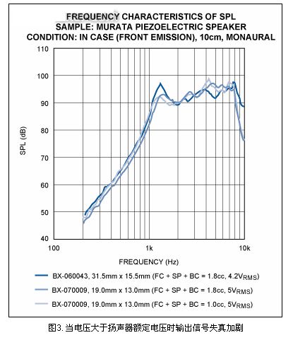 陶瓷揚聲器制造商通常規(guī)定了揚聲器的最大驅動電壓,典型值15VP-P。電壓最大時陶瓷器件的偏移量達到極限。外加電壓大于額定電壓時不會導致聲壓升高,反而增加了輸出信號的失真度。圖3為電壓最大時,陶瓷揚聲器輸出聲壓(SPL)與頻率的關系曲線。通過對比SPL與頻率的關系曲線圖以及阻抗與頻率的關系曲線圖,可以明顯看出壓電揚聲器產生高SPL時,在自激頻率處效率最高。