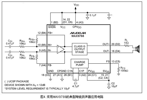 圖4中的MAX9788采用一個片上電荷泵產生與VDD相反的負電源電壓。當輸出信號需要高壓驅動時,負電源電壓作用于輸出級。MAX9788提供了一種驅動陶瓷揚聲器的優(yōu)化方案,比采用AB類放大器和升壓轉換器的傳統(tǒng)方案更高效。