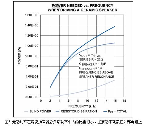 以圖5為例,5kHz時,提供給負載的總功率為629mW。效率為53%的放大器功耗為558mW。放大器功耗決定了實際器件的封裝尺寸,如果必須用高頻正弦波驅動陶瓷揚聲器,則會消耗大量功率。
