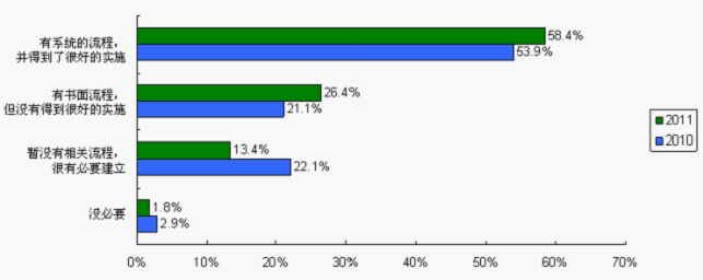 供求雙方把伙伴關(guān)系建立在專業(yè)評估的基礎(chǔ)上,通過系統(tǒng)流程可以有效減少供應(yīng)商認(rèn)證和引入過程中的不合理操作、暗箱操作、防范采購風(fēng)險、提高采購效率。在供應(yīng)商認(rèn)證與引入過程中,沒有建立和認(rèn)為沒必要建立系統(tǒng)流程的受訪者比例由2010調(diào)查的25%(22.1%+2.9%)降至2011調(diào)查的15.2%(13.4%+1.8%),已經(jīng)建立流程并且得到很好實(shí)施的比例也由2010調(diào)查的53.9%上升至2011調(diào)查的58.4%。