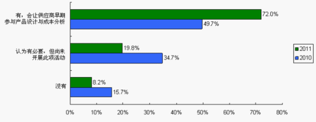 讓供應(yīng)商參與早期的產(chǎn)品設(shè)計是增進(jìn)供求雙方伙伴關(guān)系的途徑之一,借助供應(yīng)商的技術(shù)優(yōu)勢,挖掘元器件成本空間,從而提高產(chǎn)品競爭力、加快產(chǎn)品上市、降低成本。讓供應(yīng)商早期參與產(chǎn)品設(shè)計與成本分析由2010調(diào)查的49.7%大幅上升至2011調(diào)查的72%,而其中69.2%是主芯片供應(yīng)商的參與,30.8%是被動元件供應(yīng)商的參與。