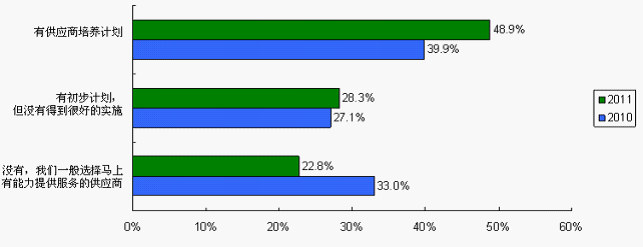 培養(yǎng)供應(yīng)商有利于建立供求雙方的伙伴關(guān)系,提高供應(yīng)商忠誠度,增強(qiáng)采購風(fēng)險抵御能力。有供應(yīng)商培養(yǎng)計劃的系統(tǒng)廠商由2010調(diào)查的39.9%上升至2011調(diào)查的48.9%,而沒有計劃的由2010調(diào)查的33%降至22.8%。