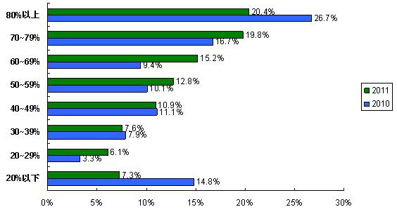 2011調(diào)查中國外品牌元器件占采購總額比例平均為58.6%,比2010調(diào)查的57.1%上升1.5%。采購國外品牌元器件占采購總額比例為70-79%、60-69%、50-59%三個區(qū)段的系統(tǒng)廠商占47.8%,是采購的主體,研發(fā)活動活躍,這三個部分呈現(xiàn)出對國外品牌元器件需求的快速增長。而采購國外品牌比例在80%以上和20%以下是采購的兩極,這兩極通過平衡采購比例來分散采購風(fēng)險,因此,這兩極的系統(tǒng)廠商數(shù)量比2010調(diào)查有顯著降低。雖然2010年的元器件缺貨給國產(chǎn)元器件進(jìn)入AVL(合格供應(yīng)商,Approved Vendor List)帶來機(jī)會,但是該趨勢還未對電子元器件供應(yīng)鏈整體產(chǎn)生顯著影響。