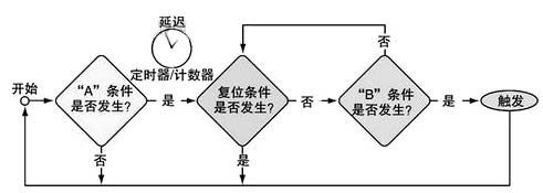 源自電腦編程領域的IF-THEN-ELSE構(gòu)成了這類觸發(fā)結(jié)構(gòu)的概念模型。如圖1所示,這些語句還包括其它判定符(如A和B之間的定時器/計數(shù)器)。不管B事件是否發(fā)生,在A事件之后隨時都可以發(fā)生復位。