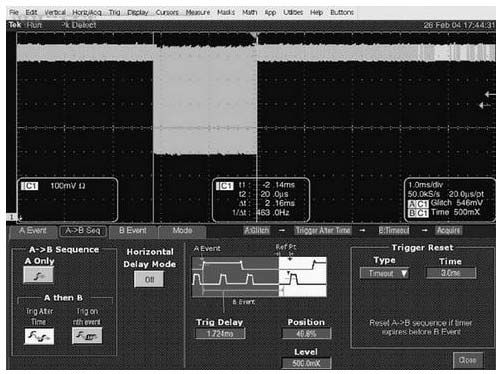 如果B觸發(fā)器只限于邊沿檢測,那么這種方法是不可能實現(xiàn)的。在這一過程中,不應忽視復位功能值,因為它決定著如果未能發(fā)生相應的A事件和B事件組合,示波器及其用戶不會一直等下去。