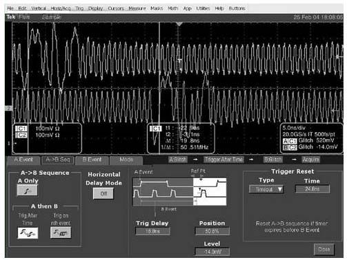 這些快速新協(xié)議中的錯誤可能來自多個事件的綜合結(jié)果,如邏輯狀態(tài)、偏移、瞬變、上升時間問題等。有時,必需規(guī)定非常精確的條件范圍,以確定難以捕捉的錯誤。這要求觸發(fā)工具系列能夠分析更多的條件??梢圆捎秒p觸發(fā)排列來解決這一問題,其中B觸發(fā)系統(tǒng)與A系統(tǒng)基本上相同。只是在許多情況下,A條件相對簡單,而在理想情況下,B觸發(fā)器應能夠評估比較復雜的一套指標,如只在其它邏輯信號處于規(guī)定狀態(tài)時才會有效的事件數(shù)量等。但是,相關觸發(fā)B一直缺乏A觸發(fā)系統(tǒng)的靈活性。因此大多數(shù)示波器僅提供了非常簡單的B觸發(fā)器。