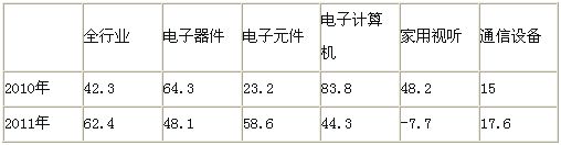 前三季度,電子元件、器件和信息機電行業(yè)分別完成投資1133、1615和1495億元,同比增長58.6%、48.1%和120.2%,三個領(lǐng)域投資占全行業(yè)的65%,比重比去年提高3個百分點,對全行業(yè)投資增長的貢獻率分別達到17%、21%和33%。整機行業(yè)投資增長放緩,其中視聽行業(yè)完成投資89.5億元,同比下降7.7%, 比重(1.4%)下降1個百分點;通信設(shè)備行業(yè)完成投資360億元,同比增長17.6%,比重(5.5%)下降2.1個百分點;計算機行業(yè)在平板電腦等新產(chǎn)品帶動下,在整機行業(yè)中增長相對較快,同比增長44.3%,但仍低于全行業(yè)18.1個百分點,其中9月份投資下降20.1%。