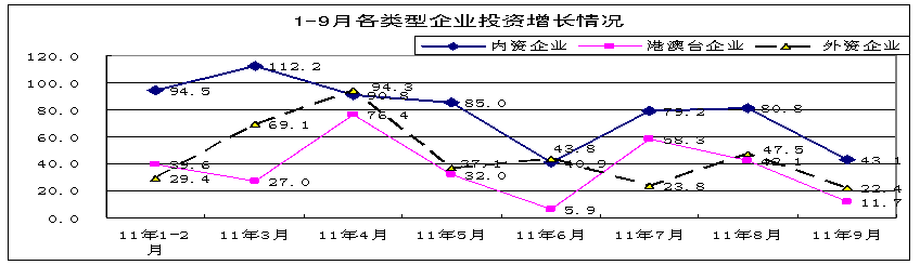 前三季度,內(nèi)資企業(yè)完成投資4821億元,占全行業(yè)的74%,同比增長72.9%,高于全行業(yè)10.5個百分點,其中私營企業(yè)增勢突出,同比增長達107.4%。外商投資和港澳臺企業(yè)分別完成投資961和710億元,同比增長42.1%和33.7%,低于全行業(yè)20.3和28.7個百分點,其中9月份分別增長22.4%和11.7%。