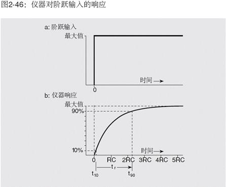 模擬儀器(或模擬輸出)的上升時間一般定義為輸入信號從零立即上升到某一固定值時,輸出信號從最終值的10%上升到90%所需要的時間。此關(guān)系示于圖2-46。圖2-46a示出假定上升時間為零的階躍函數(shù),而圖2-46b示出儀器的響應(yīng)及相應(yīng)的上升時間。單極點系統(tǒng)(1階系統(tǒng))的上升時間、頻率響應(yīng)和RC常數(shù)是有關(guān)聯(lián)的。3dB點由下式給出: