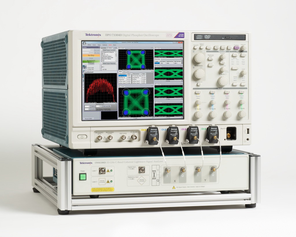 傳統(tǒng)上,光調(diào)制分析儀可與許多種示波器機型搭配使用。OM4106D是第一個與高速示波器緊密整合的光調(diào)制分析儀,這讓它的性能可以測試市場上速度最快的相干光波系統(tǒng)。DPO73304D示波器提供33GHz實時帶寬,雙通道采樣率為100 GS/s,四通道采樣率為50 GS/s。該示波器還有一個新 DataStore 公共接口,為分析任務提供2倍的從數(shù)字轉換器到實現(xiàn)OM4106D算法的 MATLAB 應用的數(shù)據(jù)吞吐率。