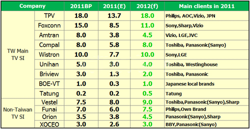 受到品牌需求減少影響,加上部分品牌增加自制比率,臺灣代工廠第三季呈現(xiàn)5.2%之衰退,但經過庫存去化及品牌預拉升年底銷售業(yè)績影響,預估第四季將有6-9%之成長力道。但整年度看來,TPV(冠捷)還是坐穩(wěn)第一名,明年如能順利掌控PHILIPS品牌,2012年度計劃有可能朝20百萬臺邁進;鴻海(Foxconn)和緯創(chuàng)(Wistron)則受到Sony大幅調降電視需求影響,今年目標恐難以達成,明年成長力道也將受到限制;仁寶(Compal)、永碩(Unihan)、景智(Briview)主要客戶群皆以日本品牌Toshiba(主要為歐日訂單)為主,日震和歐洲經濟困頓,也大大影響其年度績效;瑞軒(Amtran)則受到Vizio波及,整體代工量也未能達標。盡管臺灣電視代工廠有Philips、Sony、Toshiba及Vizio等國際品牌及自有品牌的加持,但還是逃不過大環(huán)境不佳的沖擊。